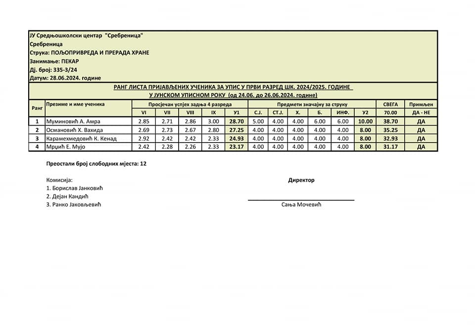 Поштовани ученици и родитељи, Обавјештавамо вас о резултатима уписа у први разред средње школе за ученике који су остварили мање од 60 бодова. Честитамо свима који су обезбједили своје мјесто у неком од наших занимања! rez1 rez4 rez5 rez2 rez3 Post navigation Резултати уписа за ученике са 60 и више бодова! Обавештење о формираним одјељењима!